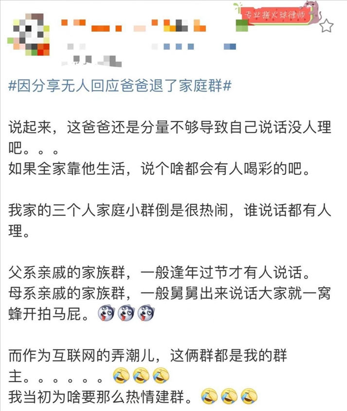 而在中國社科院社會學(xué)研究所研究員樊平的眼中,家庭群事實上是“血緣關(guān)系群”,未必是“共同生活群”,同時也未必是“利益相關(guān)群”,因此彼此之間的鏈接感會很弱。