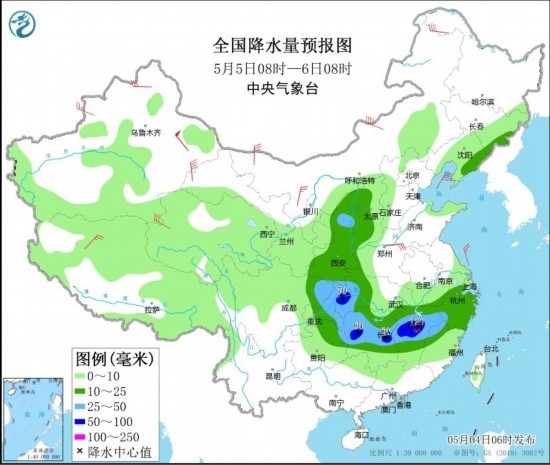 5月4日08時至5日08時,湖北南部和東部、安徽南部、湖南東北部、江西中北部、浙江西部、江蘇南部以及山東半島、遼寧南部、河北東部等地部分地區(qū)有大到暴雨,其中,安徽南部、江西北部等地部分地區(qū)有大暴雨(100~120毫米)。上述部分地區(qū)伴有短時強降水(最大小時降雨量20~40毫米,局地可超過50毫米),局地有雷暴大風(fēng)等強對流天氣。內(nèi)蒙古中部、黑龍江東北部、新疆南疆盆地、甘肅河西、山東半島等地部分地區(qū)有4~6級風(fēng),其中,新疆東部部分地區(qū)有8~9級風(fēng)。渤海、渤海海峽、黃海大部、東海北部海域?qū)⒂?~8級、陣風(fēng)9~10級的大風(fēng)。
