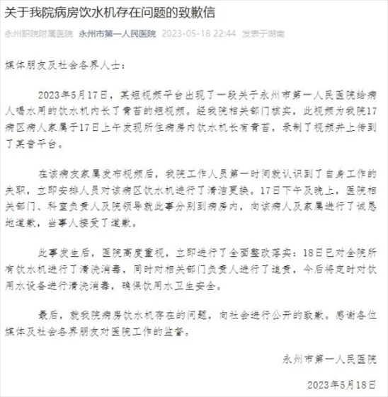 ·永州第一人民醫(yī)院致歉病房飲水機(jī)長(zhǎng)青苔:追責(zé)相關(guān)部門(mén)負(fù)責(zé)人。