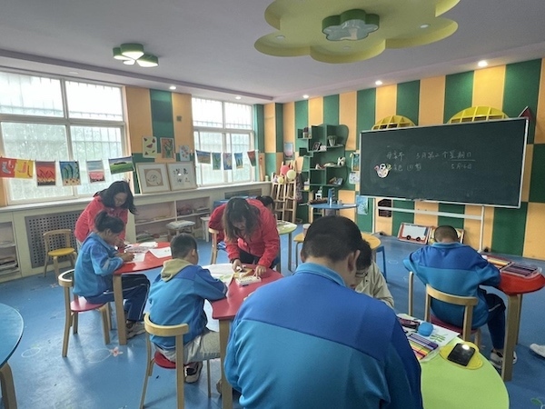 劉若晨(靠窗左一)和其他老師在指導(dǎo)學(xué)生做手工。人民網(wǎng) 高清揚攝