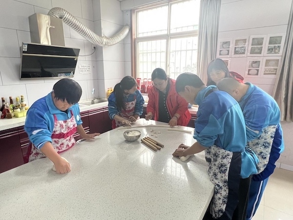走進(jìn)陜西省渭南市特殊教育學(xué)校,手鼓聲、搟面聲、冰壺與地面摩擦聲此起彼伏;由教師扮演的“超市收銀員”正為“購物”的學(xué)生結(jié)賬;“自助取款機(jī)”前,幾位小朋友正排著隊學(xué)習(xí)如何存取現(xiàn)金;醫(yī)院“問診臺”、“掛號處”等模擬窗口應(yīng)有盡有……在這里,飽含愛心、耐心、責(zé)任心的教學(xué)態(tài)度和幫助特殊兒童自理、自立、自強(qiáng)的教育初衷滋養(yǎng)著每一名學(xué)生平安成長。