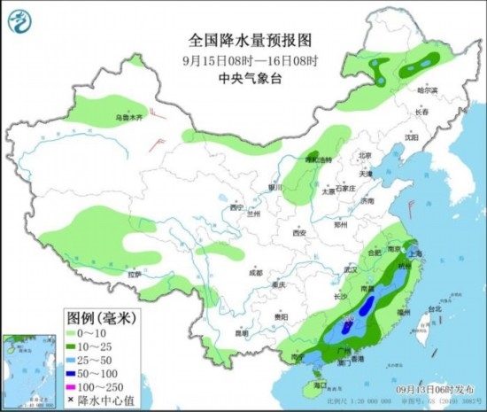 9月15日08時(shí)至16日08時(shí),內(nèi)蒙古東北部、黑龍江西南部、江南中東部和南部、華南大部等地部分地區(qū)有中到大雨,其中,江西中南部、廣東北部等地部分地區(qū)有暴雨或大暴雨(100~150毫米)。新疆東部部分地區(qū)有4~6級風(fēng)。