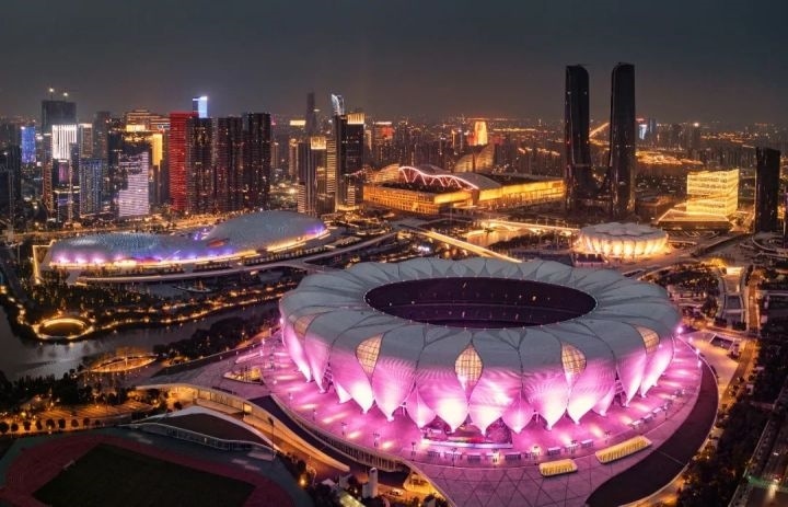 比如充滿想象的場館設計。錢塘江畔的“大蓮花”,其建筑體態(tài)源于錢塘江水的動態(tài),給人以震撼的同時,也“盛放”出浙江的文化底蘊和藝術(shù)魅力;“水?!杯h(huán)繞的手球館,外觀別具一格,“條條水?!贝孤浜苁俏?;以“杭州傘”為造型的曲棍球場,則詮釋出江南古典美學十足的浪漫韻味。