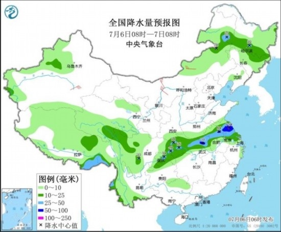 全國(guó)降水量預(yù)報(bào)圖(7月6日08時(shí)-7日08時(shí))。圖片來源:中央氣象臺(tái)網(wǎng)站