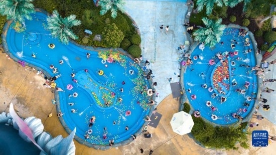 7月8日,游人在湖北省襄陽市華僑城奇夢海灘水樂園游玩(無人機照片)。