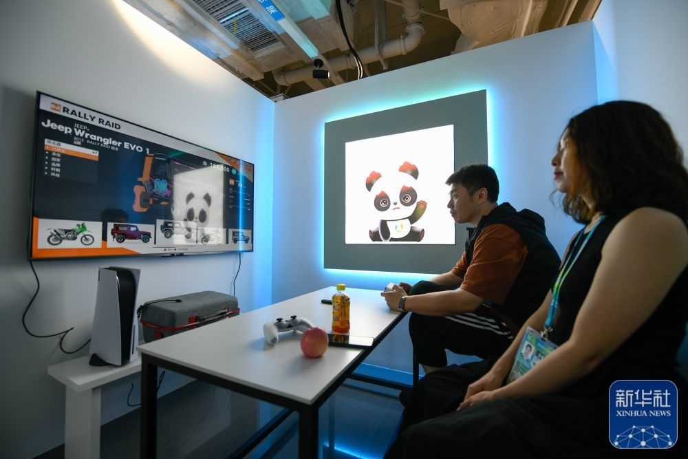 ↑7月14日,媒體工作人員在成都大運(yùn)會(huì)主媒體中心休閑娛樂(lè)區(qū)內(nèi)游玩。新華社記者 胥冰潔 攝