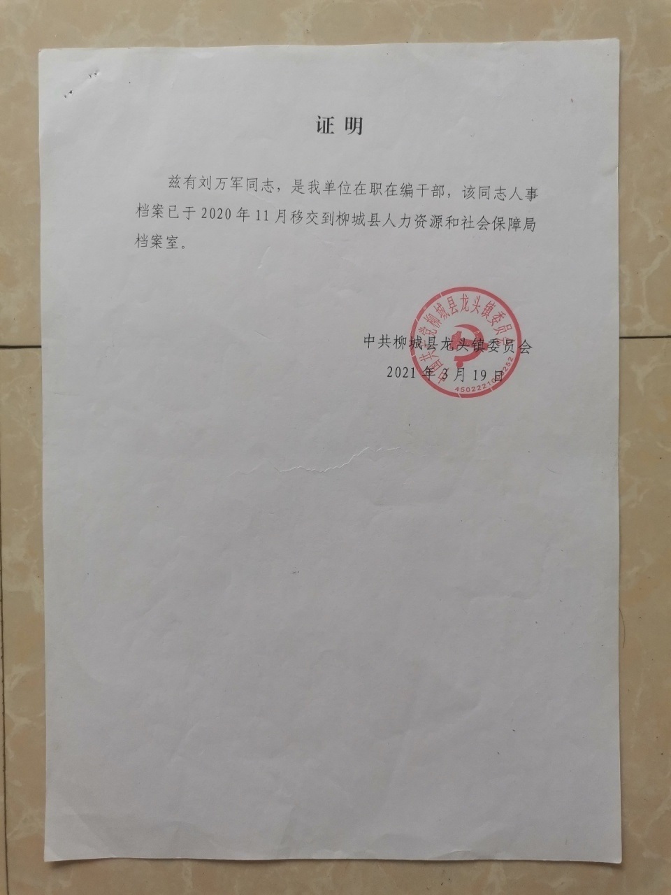 柳城縣太平鎮(zhèn)和龍頭鎮(zhèn)都曾出具《證明》,指出劉萬(wàn)軍屬“在職在編人員”。圖/劉萬(wàn)軍提供