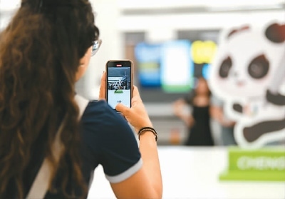 成都天府國際機場內(nèi),抵蓉的巴西代表團成員在等候行李時拍攝機場內(nèi)的大運會吉祥物“蓉寶”裝飾。新華社記者 胥冰潔攝