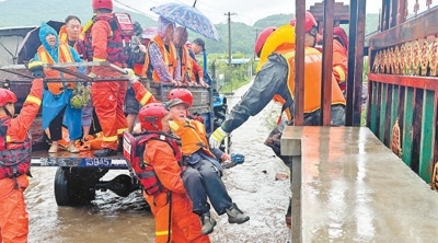 8月4日,黑龍江尚志市一面坡鎮(zhèn)萬山村,哈爾濱市森林消防支隊(duì)隊(duì)員正在解救被困村民。新華社發(fā)