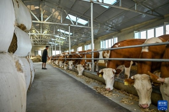 8月3日,在扎魯特旗巨日合鎮(zhèn),養(yǎng)殖戶李和在喂牛,他與合作社簽訂了托管代養(yǎng)協(xié)議,托管代養(yǎng)了10頭基礎(chǔ)母牛。