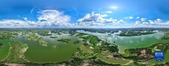 8月6日,湖南桂陽舂陵國家濕地公園,綠水、濕地、藍(lán)天相映成趣,構(gòu)成一幅秀美的夏日生態(tài)畫卷(無人機(jī)全景照片)。
