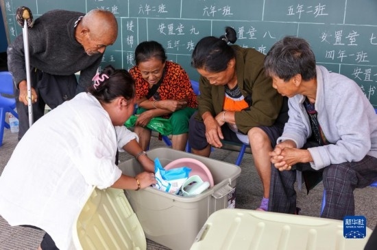 8月11日,居民在吉林省舒蘭市舒蘭三中居民安置點領(lǐng)取舒蘭市紅十字會發(fā)放的藥品物資。