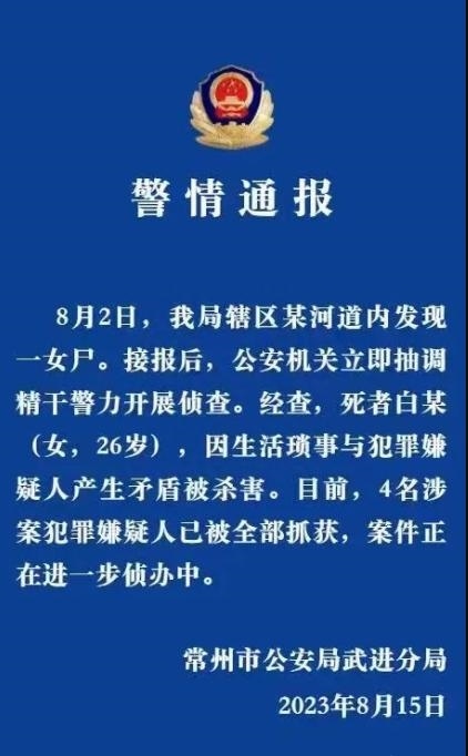 ·警方通報江蘇常州一女子被分尸:4名嫌疑人為兩男兩女,均已落網。