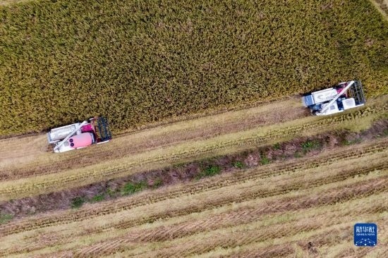 在湖北省天門市石家河鎮(zhèn)唐店村,農(nóng)民操作農(nóng)機(jī)收割水稻(無(wú)人機(jī)照片,10月19日攝)。