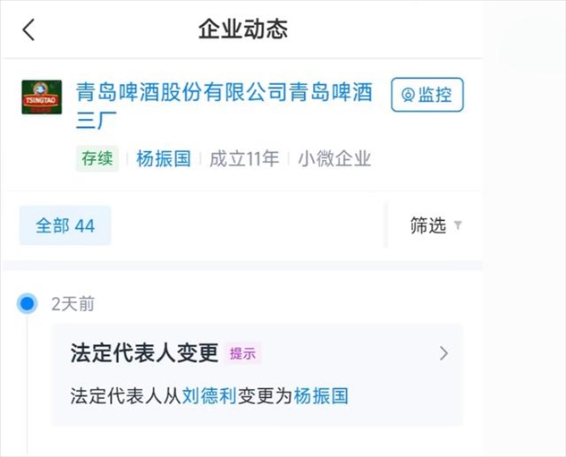 ·涉小便事件青島啤酒三廠更換法定代表人。