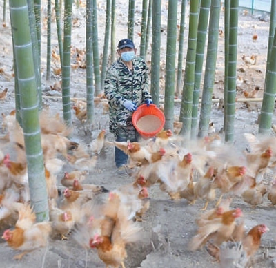 安吉縣利用良好生態(tài)優(yōu)勢發(fā)展林下養(yǎng)殖。圖為農(nóng)戶正給竹林雞喂食。夏鵬飛攝