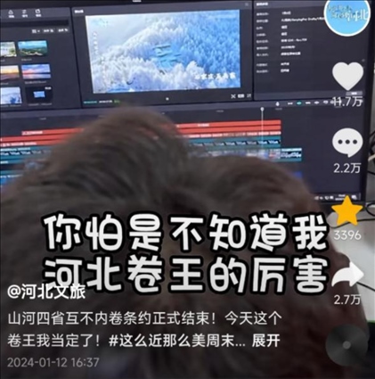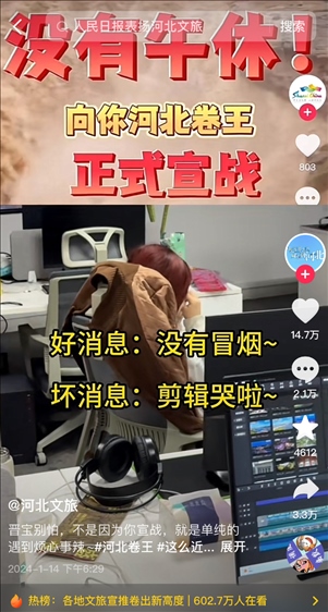 有網(wǎng)友建議賬號改名為“河北文旅”,“不然都搜不到”,“聽勸”的官方賬號火速改名,并發(fā)布視頻“宣戰(zhàn)”,“山河四省互不內(nèi)卷條約正式結(jié)束,今天這個卷王我當定了”,于是開始“瘋狂輸出”,日更75條,可還了得?