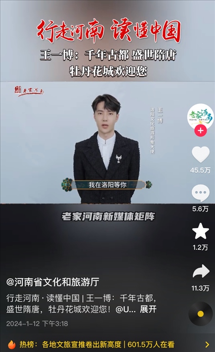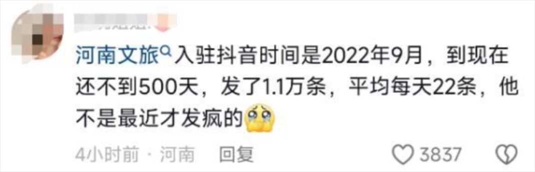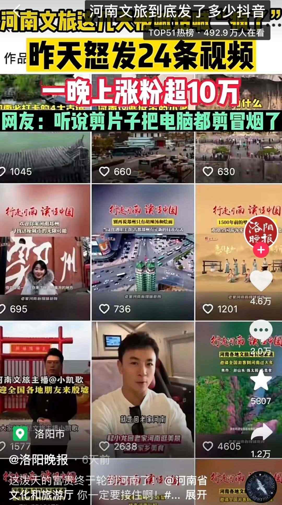 有人統(tǒng)計,自1月9日起,河南文旅官方賬號“河南省文化和旅游廳”每天發(fā)布二三十條視頻,連續(xù)四天發(fā)布了112條視頻,持續(xù)展示本地文旅資源,吸引了近百萬新粉絲,主打一個“量變總會引起質(zhì)變”,以至于“河南文旅到底發(fā)了多少抖音”相關話題成為熱門搜索。
