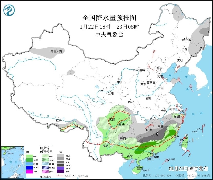 預(yù)計(jì)21日,湖北西南部、湖南中西部和北部、貴州中東部和西南部、重慶東部等地的部分地區(qū)有大到暴雪,其中,湖南西部、貴州東北部等地的部分地區(qū)有大暴雪(20~22毫米)。上述部分地區(qū)新增積雪深度3~8厘米,局地可達(dá)10厘米以上。此外,貴州、湖南西部和南部、廣西北部、廣東北部等地局地有凍雨。