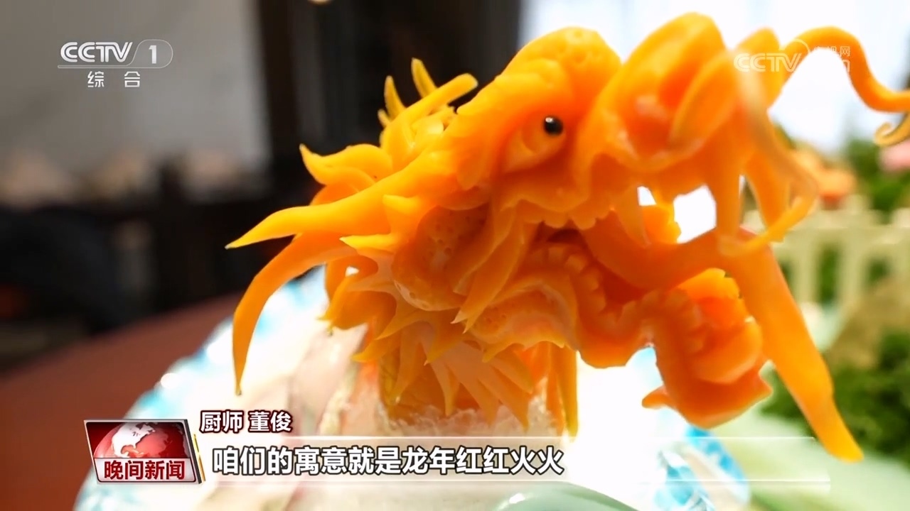 廚師 董?。?/strong>把魚(yú)切成薄片,用濃湯涮熟,擺盤(pán)呈現(xiàn)一條龍的造型,咱們的寓意就是龍年紅紅火火、風(fēng)調(diào)雨順、年年有余。