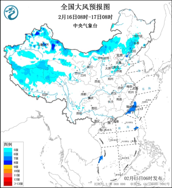 2月15日08時(shí)至16日08時(shí),新疆北部、西藏東部和南部、川西高原中北部等地部分地區(qū)有小到中雪或雨夾雪,其中,新疆阿勒泰地區(qū)有大到暴雪,部分地區(qū)有大暴雪,局地特大暴雪(30~35毫米)。江淮大部、江漢東部、江南、西南地區(qū)東部、華南西部等地部分地區(qū)有小到中雨。西藏中部、內(nèi)蒙古大部、遼寧西部、遼東半島、山東半島、江蘇南部、上海、湖南中北部等地部分地區(qū)有4~6級(jí)風(fēng),其中,浙江中東部部分地區(qū)有6~7級(jí)風(fēng);黃海大部海域、東海大部海域、臺(tái)灣海峽有7~8級(jí)、陣風(fēng)9級(jí)的大風(fēng)(見圖3)。
