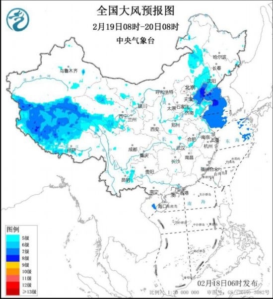 2月18日8時(shí)至19日8時(shí),新疆南疆盆地東部、西藏中西部、青海南部、甘肅河西、內(nèi)蒙古中西部、遼寧中西部等地將有5~6級、陣風(fēng)7~8級的大風(fēng);渤海、渤海海峽、黃海北部海域、東海北部海域?qū)⒂?~8級、陣風(fēng)9~10級的大風(fēng)。2月19日8時(shí)至20日8時(shí),西藏中西部、青海南部、甘肅河西、內(nèi)蒙古中東部、遼寧西部和南部等地將有5~6級、陣風(fēng)7~8級的大風(fēng);渤海、渤海海峽、黃海大部海域?qū)⒂?~8級、陣風(fēng)9~10級的大風(fēng)。中央氣象臺2月18日6時(shí)繼續(xù)發(fā)布大風(fēng)藍(lán)色預(yù)警。