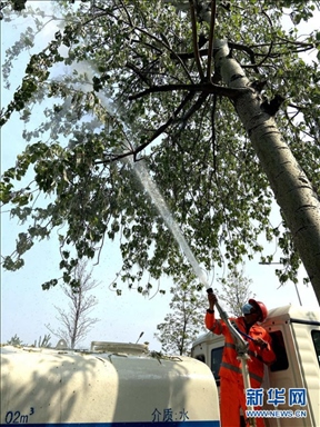圖六:在北京豐臺區(qū),一名工作人員用高壓水槍對楊樹雌株進(jìn)行噴水濕化以減少飛絮。(來源:新華社)
