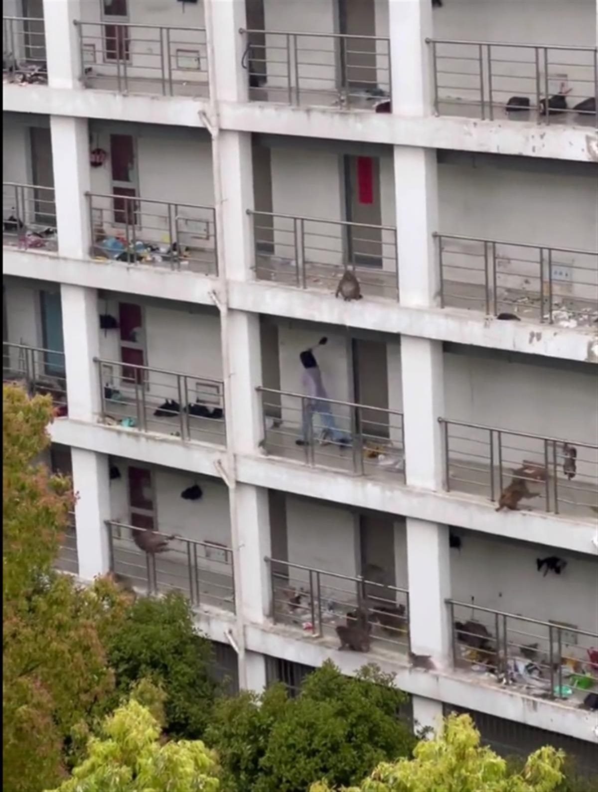 網(wǎng)絡視頻顯示,多只猴子在一棟大學生宿舍的走廊上奔跑,一名女生拿著一把傘一路驅(qū)趕;大樓多層走廊上的垃圾袋也被猴群弄破,地面上一片狼藉。