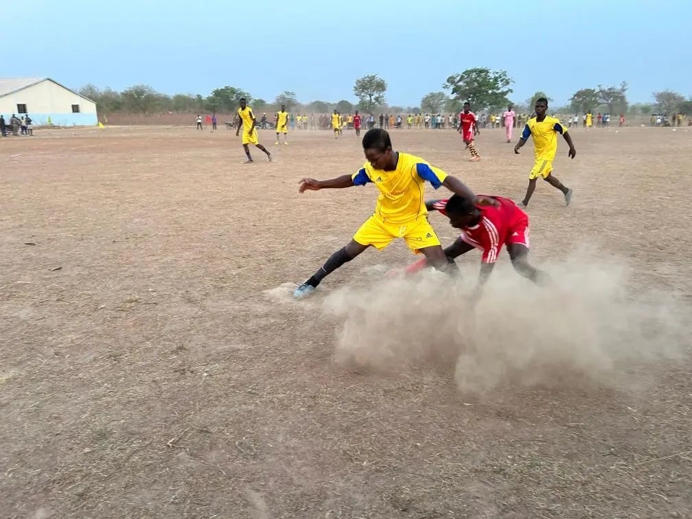 3月31日,貝寧當?shù)卮迕袂騿T在非洲“村超”比賽中拼搶。受訪者供圖