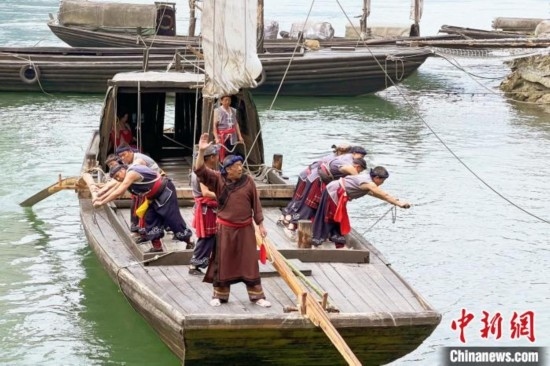 “天天拉船三峽邊吶,哎喲……”18日清晨,湖北省宜昌市三峽人家風(fēng)景區(qū),隨著船夫們有節(jié)奏地?fù)u槳升帆,峽江號(hào)子回響在長(zhǎng)江三峽西陵峽山水間。
