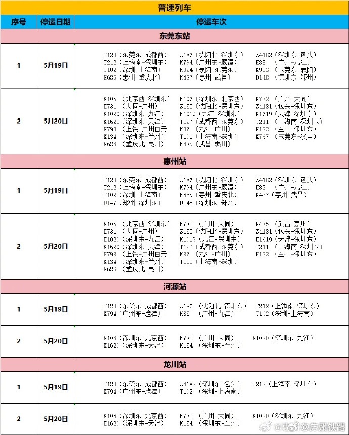 央視網(wǎng)消息:據(jù)@廣州鐵路 微博消息,根據(jù)中央氣象臺消息,近日湖南西南部、廣東大部有大到暴雨局地有特大暴雨。受此影響,為確保鐵路運輸安全,鐵路部門將對途經(jīng)京廣、京九普速線等線路列車采取限速運行和停運措施,同時各車站列車將出現(xiàn)不同程度晚點,由此給廣大旅客帶來的不便,敬請諒解。東莞東、惠州、河源、龍川站停運車次具體如下。