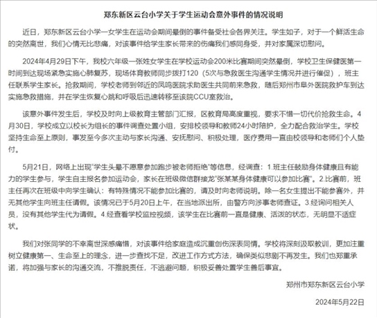 ·鄭州一小學(xué)生短跑暈倒后離世,學(xué)校通報(bào)系自主報(bào)名賽前無(wú)不適。