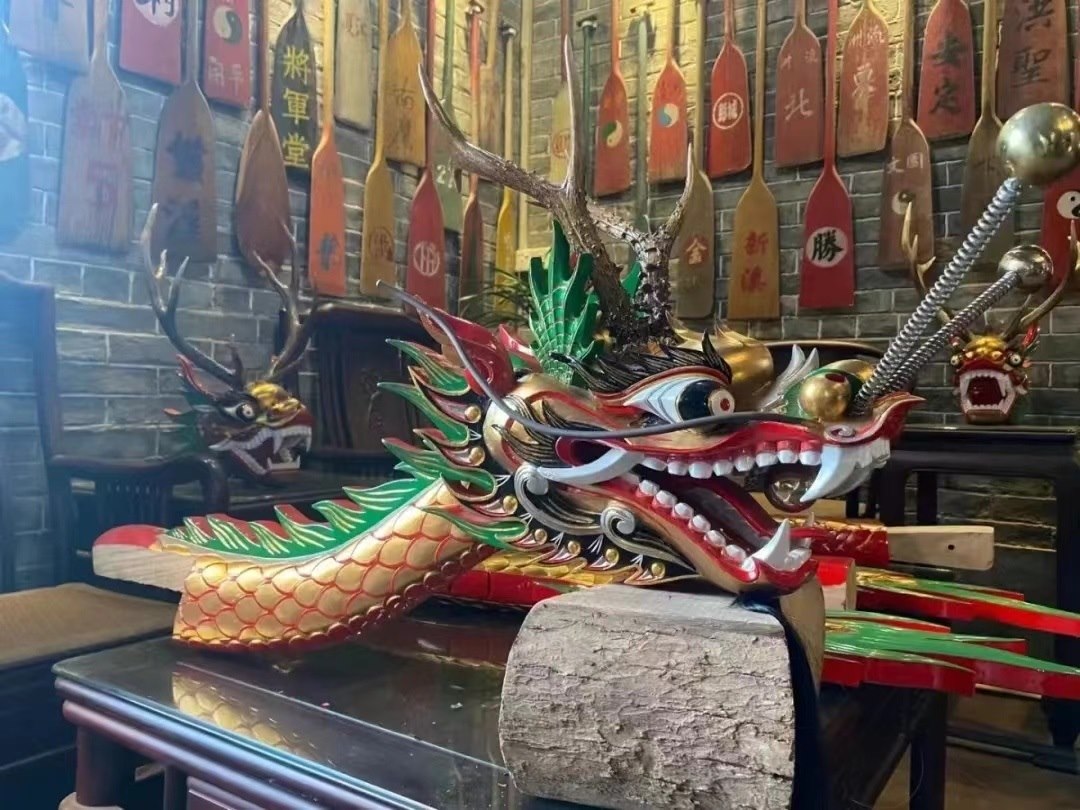 張偉潮的訂單從此就沒斷過,即使已經(jīng)是廣州黃埔區(qū)非遺項目“龍舟龍頭、龍尾制作技藝”代表性傳承人,如今面對每一筆新訂單,張偉潮依然像走進考場。心底的忐忑,源于不甘,不甘重復(fù)父輩,也不甘重復(fù)自己。“每一代人都會有每一代的改良進步,傳統(tǒng)文化要跟著社會的腳步前進?!崩鲜降凝堫^模樣,有著平貼的眉毛,張偉潮將它做成立體雕刻,顯得更加威風(fēng)凜凜;涂抹的變溫顏料,令龍頭出水的瞬間動人心魄。