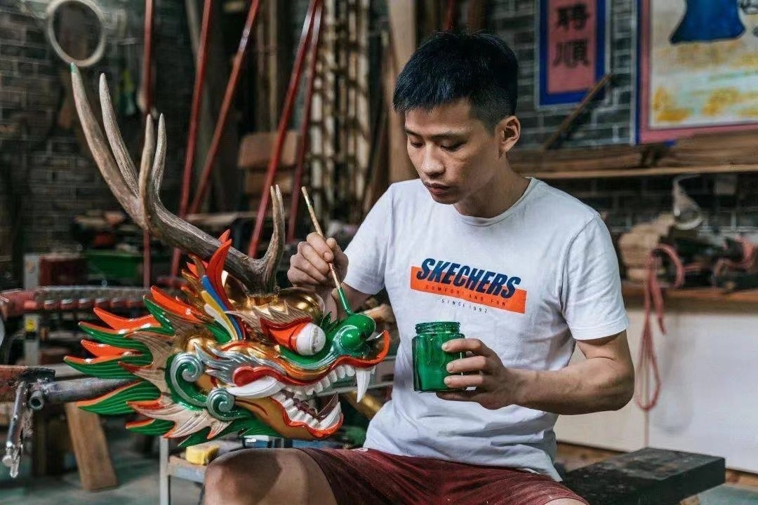 十五年間,張偉潮已記不清他雕刻或翻新了多少龍頭,同樣的刀銼雕鏤,卻是各不相同的勇猛威嚴(yán),慈眉善目。形態(tài)各異的龍頭之上,承載的是一個村落的鄉(xiāng)愁,一支隊伍的雄心,一方百姓的豪情。最初一家三口扛起的小作坊,也迎來了越來越多的年輕學(xué)徒。