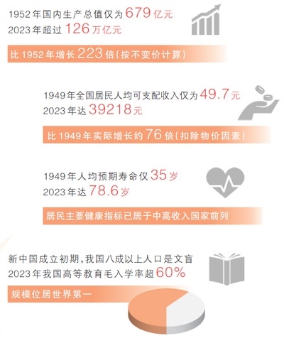 各行各業(yè)的發(fā)展成就,人民生活的蒸蒸日上,濃縮在一組組數(shù)據(jù)中。與新中國成立初期相比,2023年國內(nèi)生產(chǎn)總值增長223倍、人均GDP增長89倍、人均預(yù)期壽命提高43.6歲、農(nóng)村貧困人口全部脫貧……國家統(tǒng)計局近日發(fā)布新中國成立75年經(jīng)濟社會發(fā)展成就系列報告,“數(shù)”說75年偉大成就,本版“大數(shù)據(jù)觀察”欄目推出特別報道,記錄同心同德、艱苦奮斗的奮進歷程,匯聚共襄強國建設(shè)、民族復(fù)興偉業(yè)的磅礴力量。