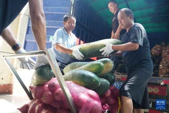7月7日,工作人員在華容縣職業(yè)中專安置點(diǎn)搬運(yùn)社會捐贈的農(nóng)產(chǎn)品。