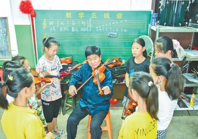 教學漸漸步入正軌后,張玉立還將支教的范圍擴大到其他4個同樣偏僻的鄉(xiāng)鎮(zhèn)。山路崎嶇,往返山間,張玉立樂此不疲?!啊亚俾曀瓦M大山’不僅能夠豐富孩子們的生活,還可以幫助他們走出大山?!睆堄窳⒄f,經(jīng)過一段時間的教學以后,自己開始有意識地挑選對小提琴有興趣、有天賦的孩子,成立小提琴班,利用課外時間進行專門訓練。