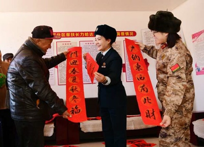 遼寧省朝陽市龍城區(qū)聯(lián)合鎮(zhèn)長(zhǎng)立哈達(dá)村,朝陽軍分區(qū)官兵給幫扶老年人送春聯(lián)。