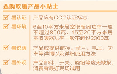 “小太陽”、暖風機、油汀等電取暖器具屬于國家強制性認證產(chǎn)品,必須經(jīng)過產(chǎn)品認證并帶有中國強制性產(chǎn)品認證即CCC認證標志。室內(nèi)加熱器應(yīng)符合國家強制性標準《家用和類似用途電器的安全第1部分:通用要求》(GB4706.1)和《家用和類似用途電器的安全第2部分:室內(nèi)加熱器的特殊要求》(GB4706.23)的相關(guān)要求。