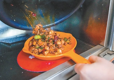 劉楊化身“主人公”,開始了“一肩挑”的演示:觸摸屏上勾選心儀菜品,手機(jī)掃碼支付,冷柜取出對應(yīng)號碼的配菜盒,打開密封包裝,加入佐料包,將配菜盒整體放入炒菜機(jī)器人,然后選擇相應(yīng)的炒菜程序。