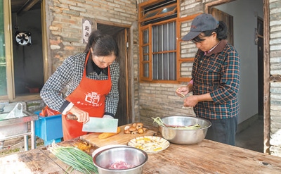 培田村老年食堂廚房內,周雪梅(左)正在備菜。