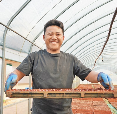 種好超級雜交水稻,秧苗質量很重要。農技人員要提前浸種、曬種,防治多種傳染病害。在基地,農戶也早早準備了育秧材料。倒入基質土、送入秧盤、鋪土、澆水、撒種、蓋土……一系列工序后,育秧盤送入暗室催芽,再過兩天,擺進溫室大棚。