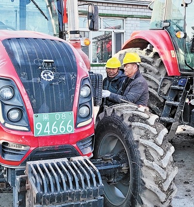 農機庫里,社員程傳寶蹲在拖拉機旁仔細檢查,反復確認有沒有漏油,或者零件松動。