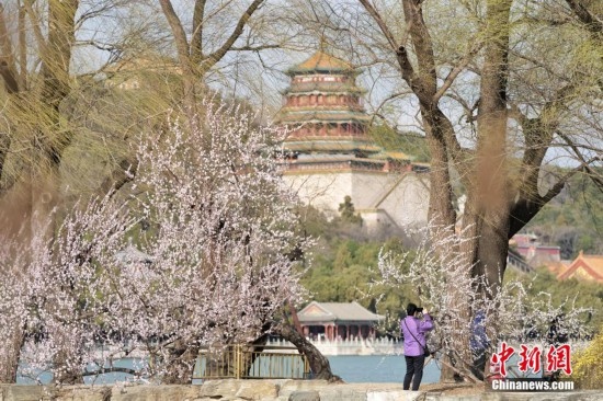 3月17日,游客在北京頤和園西堤賞花。近日,北京頤和園西堤山桃花進(jìn)入最佳觀(guān)賞期,吸引眾多游客前往賞花。