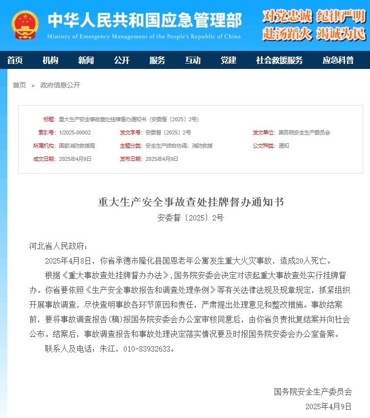 人民網(wǎng)北京4月9日電 (記者溫璐、郝萍)據(jù)應(yīng)急管理部消息,4月9日,國(guó)務(wù)院安全生產(chǎn)委員會(huì)發(fā)布向河北省人民政府發(fā)布重大生產(chǎn)安全事故查處掛牌督辦通知書。通知書稱,2025年4月8日,河北省承德市隆化縣國(guó)恩老年公寓發(fā)生重大火災(zāi)事故,造成20人死亡。根據(jù)《重大事故查處掛牌督辦辦法》,國(guó)務(wù)院安委會(huì)決定對(duì)該起重大事故查處實(shí)行掛牌督辦。河北省要依照《生產(chǎn)安全事故報(bào)告和調(diào)查處理?xiàng)l例》等有關(guān)法律法規(guī)及規(guī)章規(guī)定,抓緊組織開(kāi)展事故調(diào)查,盡快查明事故各環(huán)節(jié)原因和責(zé)任,嚴(yán)肅提出處理意見(jiàn)和整改措施。事故結(jié)案前,要將事故調(diào)查報(bào)告(稿)報(bào)國(guó)務(wù)院安委會(huì)辦公室審核同意后,由河北省負(fù)責(zé)批復(fù)結(jié)案并向社會(huì)公布。結(jié)案后,事故調(diào)查報(bào)告和事故處理決定落實(shí)情況要及時(shí)報(bào)國(guó)務(wù)院安委會(huì)辦公室備案。