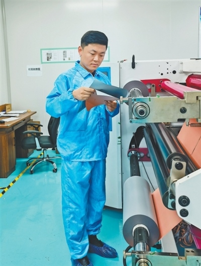 天厚新材料產業(yè)園的實驗室里,王涵龍正在進行遮光導電類材料的研發(fā)工作。