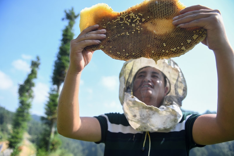 △十八洞村村民龍先蘭學(xué)習(xí)養(yǎng)蜂技術(shù),因地制宜發(fā)展養(yǎng)蜂產(chǎn)業(yè),逐漸成為養(yǎng)蜂大戶(hù),還收獲了甜蜜的愛(ài)情。
