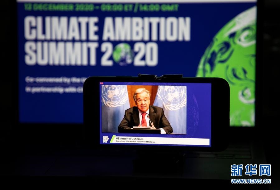 這是2020年12月12日在美國(guó)紐約拍攝的聯(lián)合國(guó)秘書(shū)長(zhǎng)古特雷斯在氣候雄心峰會(huì)上通過(guò)視頻發(fā)表講話(huà)的屏幕畫(huà)面。氣候雄心峰會(huì)由聯(lián)合國(guó)及有關(guān)國(guó)家倡議舉辦,旨在紀(jì)念《巴黎協(xié)定》達(dá)成五周年,進(jìn)一步動(dòng)員國(guó)際社會(huì)強(qiáng)化氣候行動(dòng),推進(jìn)多邊進(jìn)程。新華社記者