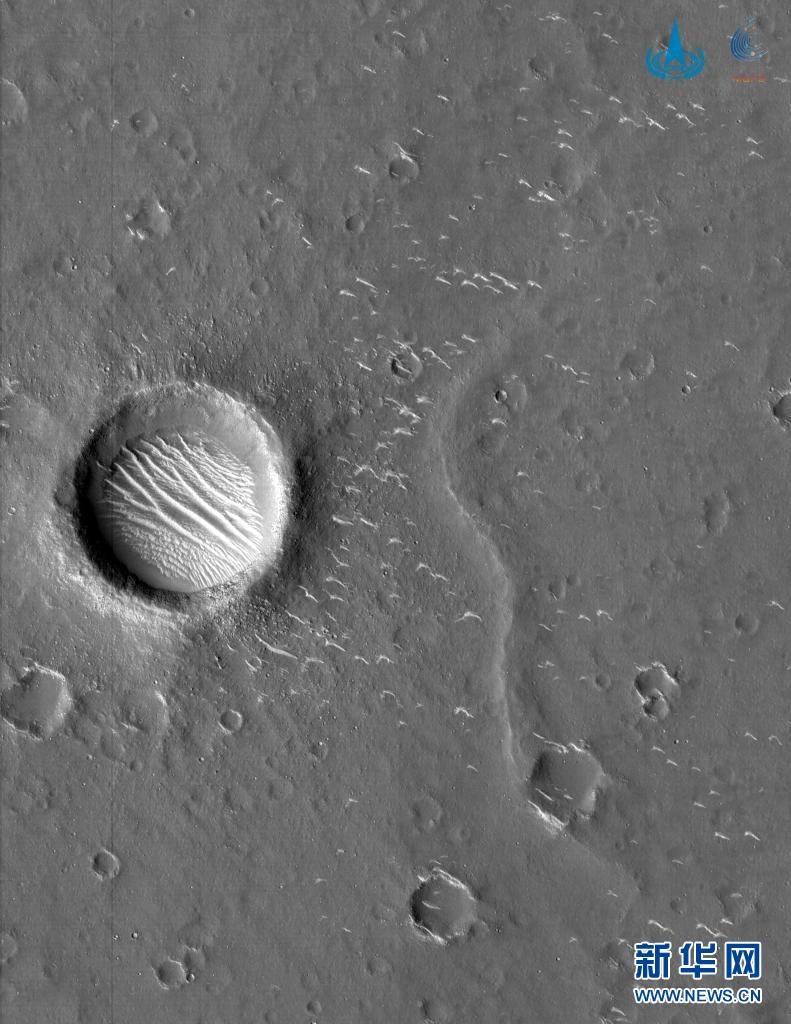 ——首拍火星,成功獲取中國首幅近火圖像。2021年2月5日,國家航天局發(fā)布了天問一號在距離火星約220萬公里處,獲取的首幅火星圖像。本次成像采用環(huán)繞器高分辨率相機的黑白成像模式。