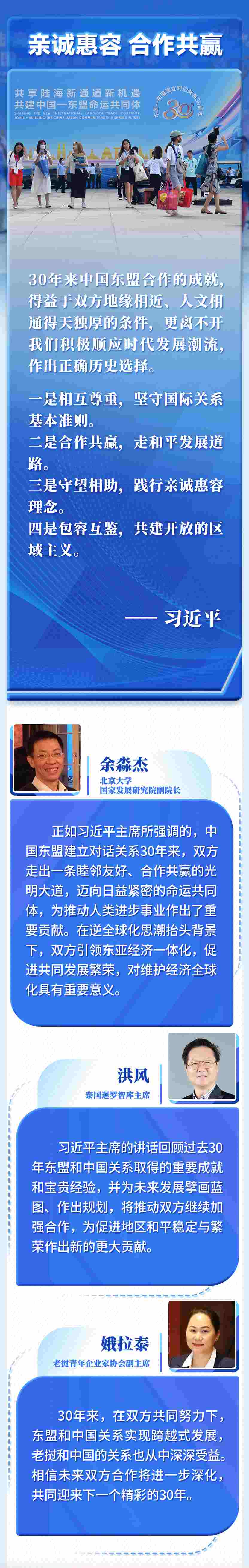 30年的寶貴經驗是中國和東盟的共同財富,為雙方發(fā)展全面戰(zhàn)略伙伴關系奠定了基礎、提供了遵循。我們要倍加珍惜、長久堅持,并在新的實踐中不斷豐富和發(fā)展。